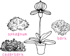 パフィオペディラムほど、植え込み材に何を用いるかで意見の分かれるランはありません。しかしどれがベストというのはなく、ミズゴケやバーク、杉皮など、どんな材料でも基本を守りさえすれば、まずまずの結果を出すことができます。最大のポイントは自分にとっての使い易さです。次に置き場所と、水管理の習慣に材料が合っているかを確認します。極端に乾きにくい、また逆に乾燥が早いという材料は見直さなくてはなりません。