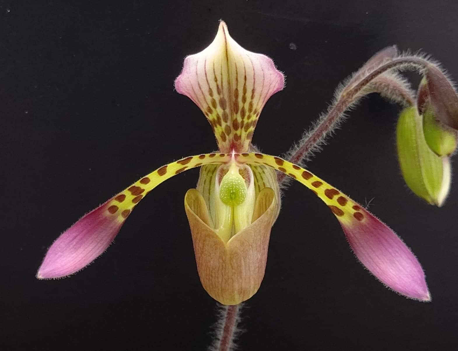 彼が蘭に興味を持ったのはそれより遡る昔、戦後間もない中学生くらいの頃で、門弟として徳川圀斉氏に師事して以来、未知の種を自らの手で作り出す、摩訶不思議な洋ランワールドに魅了されて行きました。とりわけ彼が夢中になったのは、パフィオペディラムという一風変わった趣の蘭です。